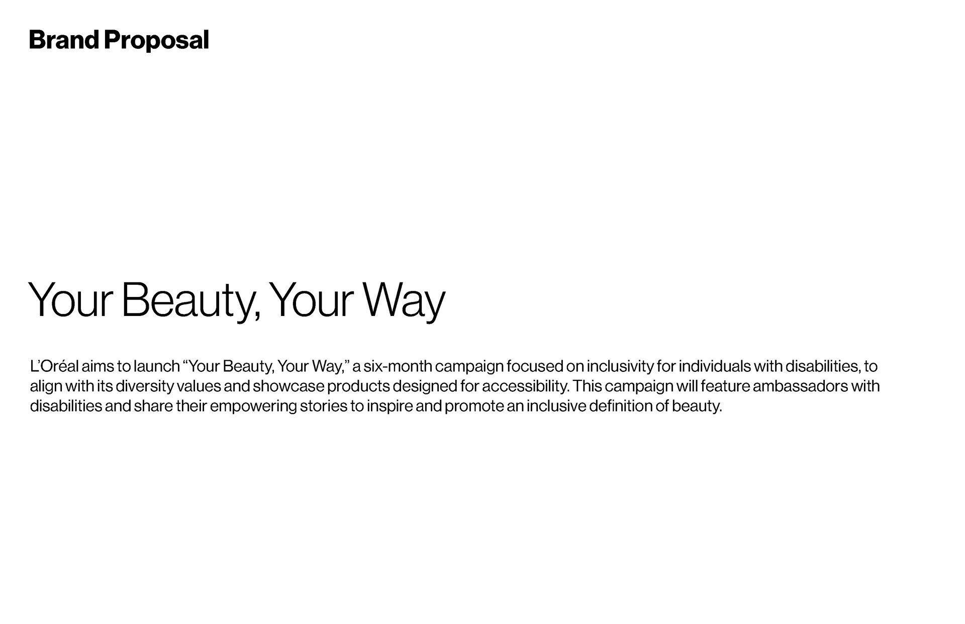 I created "Your Beauty, Your Way" as a concept campaign imagining how L’Oréal could expand beauty standards through real disability inclusion. The six-month campaign would spotlight ambassadors with disabilities, sharing their own stories and showing that beauty doesn’t fit a single mold.