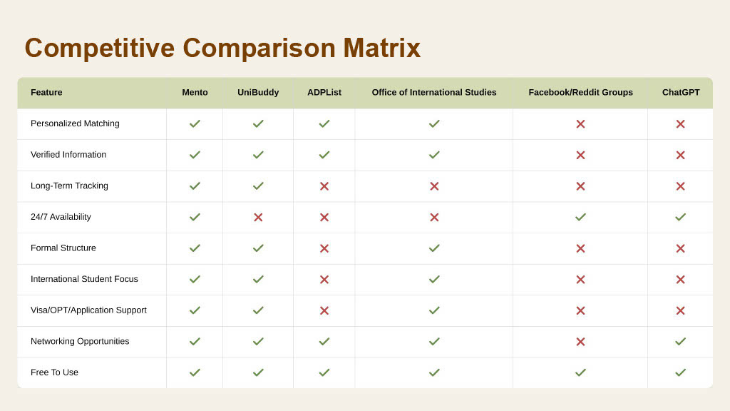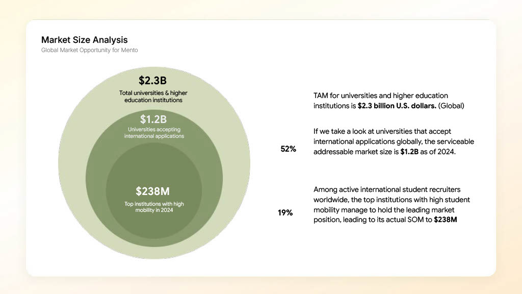 I defined the key customer segments — universities, OIS departments, and education partners — and analyzed their needs and constraints to understand where Mento could create real value. This work helped us size the market, prioritize high-impact partners, and position Mento as a scalable institutional solution instead of a consumer app.