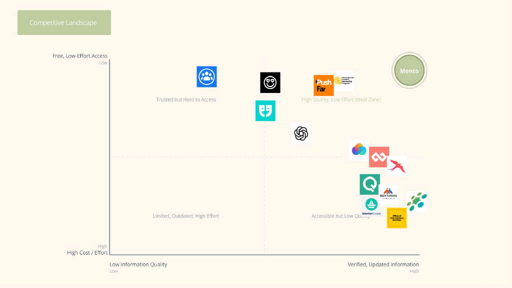 We developed the business strategy behind Mento by analyzing market size, competitive positioning, and projected costs. This work grounded the concept in real numbers and demonstrated how the platform could scale sustainably over three years.