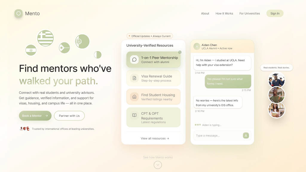 I collaborated with an interdisciplinary IYA team to shape Mento from an early idea into a focused strategic concept aimed at improving the fragmented support international students receive in U.S. education systems.